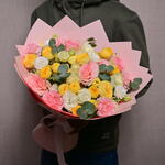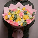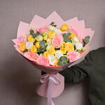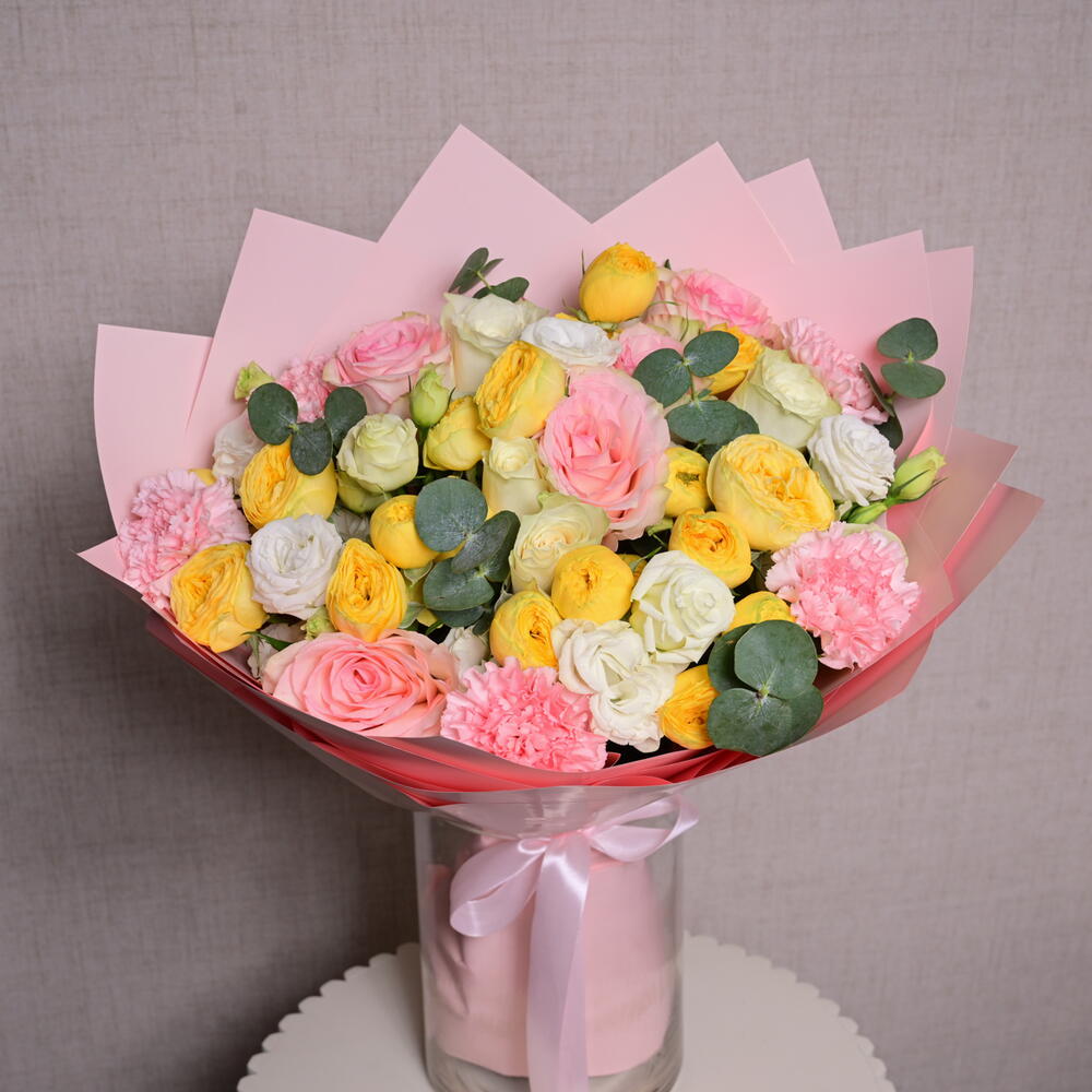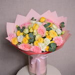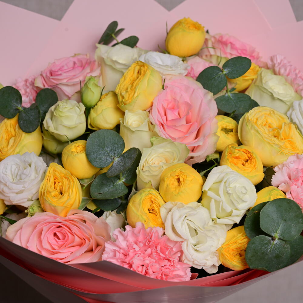 Eucalyptus - 1 шт. Pink rose - 5 шт. White rose - 5 шт. Lisianthus - 5 шт. carnation - 5 шт. wrapping paper - 4 шт. желтая пионовидная спрей-роза - 5 шт.