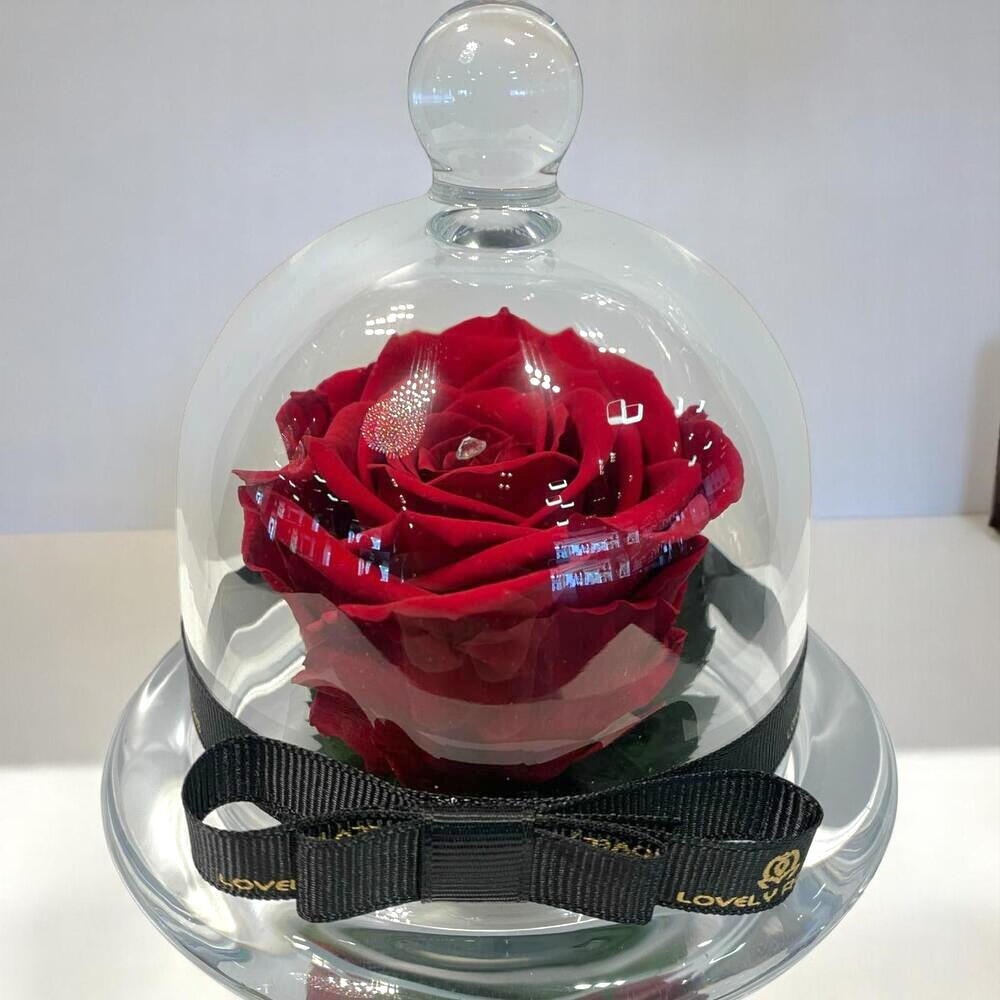 Представляем сохранённую красную розу в стеклянном куполе — завораживающую и элегантную композицию из одной потрясающей красной розы, которая сохранится на всю жизнь. Помещённая в изящный стеклянный купол, эта прекрасно сохранённая роза сохраняет яркий цвет и мягкую текстуру, делая её вечным символом любви и красоты. Роза аккуратно расположена на подушке из мягкого мха, а чёрная атласная лента придаёт всей композиции нотку утончённости. Идеально подходит в качестве подарка по особым случаям, таких как годовщины, День святого Валентина, или в качестве романтического жеста, эта роскошная композиция никогда не увянет, как и любовь, которую она олицетворяет. Стеклянный купол защищает розу, сохраняя её естественную красоту и придавая ей ещё больше элегантности. Подарок, который принесёт радость и очарование в любое пространство, навсегда сохраняя изящество одной совершенной розы.