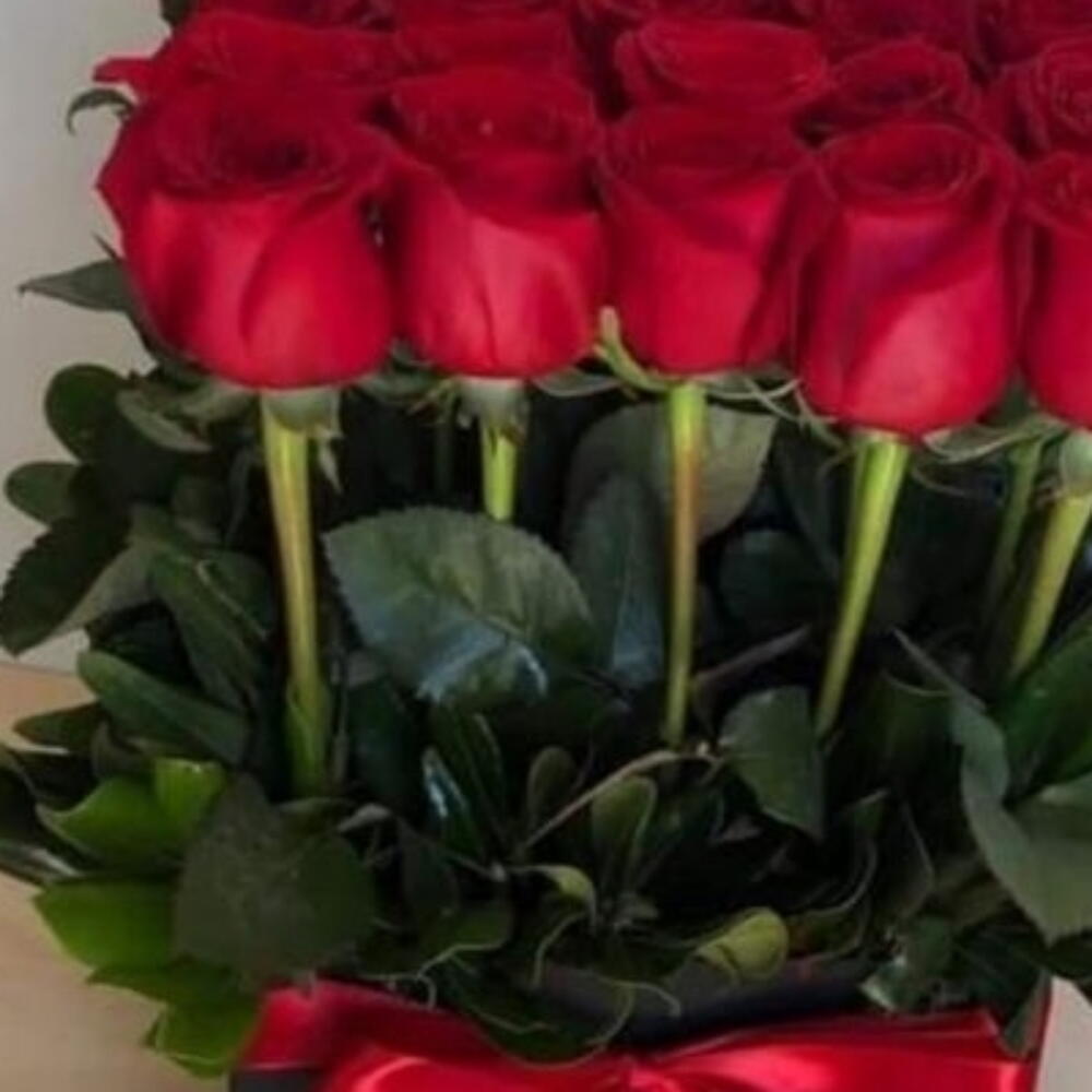 современное и роскошное оформление с яркими красными розами, помещёнными в изящную квадратную чёрную коробку, перевязанную подходящей красной лентой. Этот контрастный дизайн превращает традиционный букет в изысканный подарок.