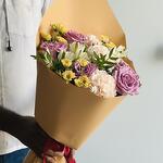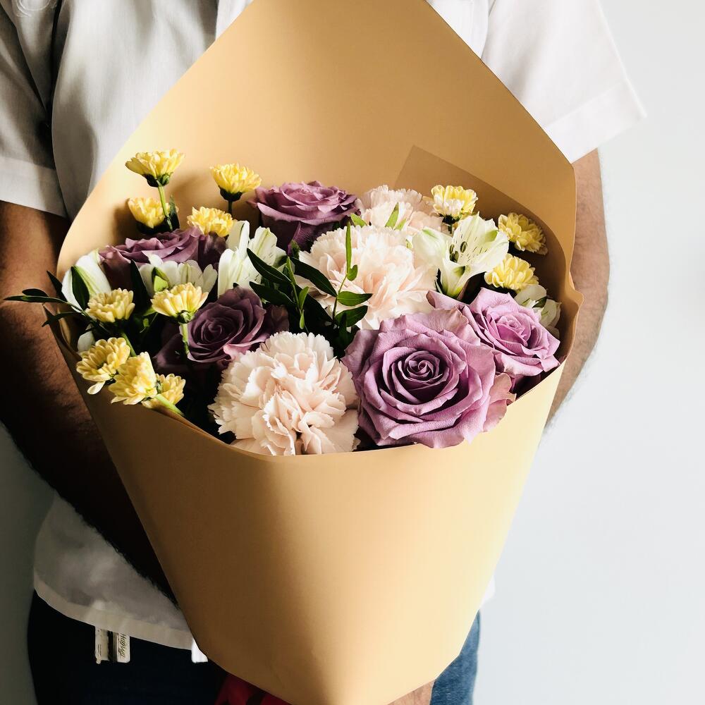 Pistacia - 2 шт. alstroemeria white - 3 шт. purple rose - 5 шт. wrapping paper - 4 шт. персиковая гвоздика - 3 шт. хризантема сантини - 3 шт.