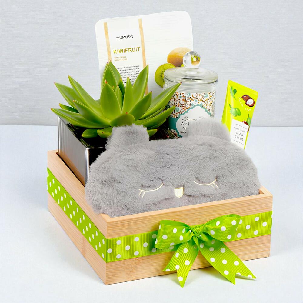 1 Растение эхеверия 1 Ароматическая свеча 1 Увлажняющий крем для рук 1 Маска для лица с ароматом киви 1 Расслабляющая повязка на глаза Оформлено на деревянном подносе