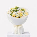 Delicate pastels with airy fillers — romantic and whimsical .White Chrysanthemum 5 Stems, Green Button Chrysanthemum 5 Stems, Peach Carnation 10 Stems, Peach Baby Rose 10 Stems