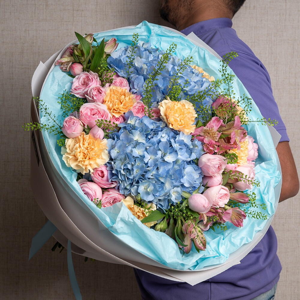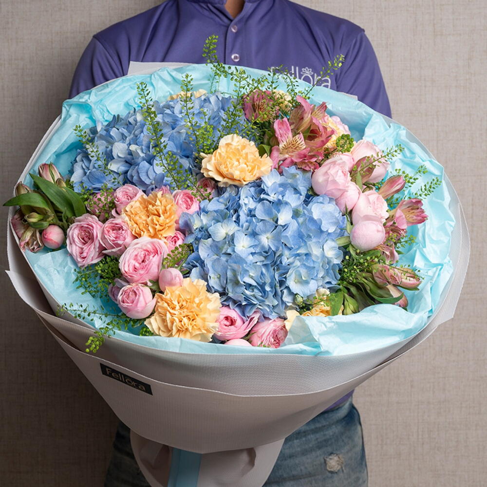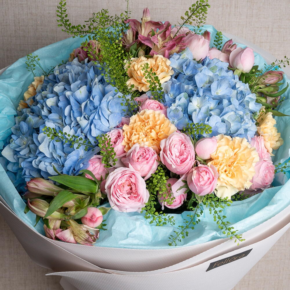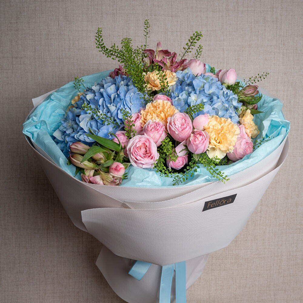 carnation - 7 шт. pink alstroemeria - 5 шт. ribbon satin - 1 шт. blue hydrangea - 2 шт. липидиум - 5 шт. украшение упаковки - 5 шт. мэнсфилд парк розовая пионовидная роза - 5 шт.