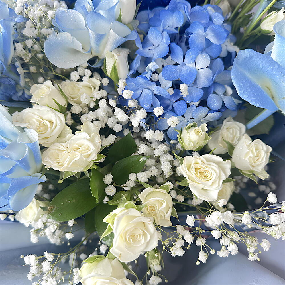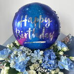 blue rose - 6 шт. white spray rose - 16 шт. blue hydrangea - 2 шт. raffia ribbon - 1 шт. фольгированный шар с днём рождения - 1 шт. флористическая упаковка - 6 шт.