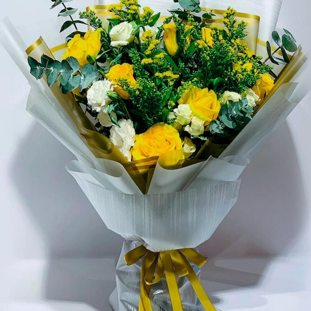 Добавьте яркой элегантности в любой праздник с этим сияющим букетом, наполненным яркими жёлтыми розами и пышной зеленью. Эта цветочная композиция, окутанная нежными белыми и золотистыми акцентами, идеально подойдёт для того, чтобы скрасить чей-то день или отметить радостное событие. Гармоничное сочетание цветов и листвы создаёт тепло и свежесть, добавляя изысканный штрих в любую обстановку. Идеально подходит для дней рождения, поздравлений или просто потому, что этот букет – символ счастья и жизненной силы. Храните его в прохладном месте, вдали от прямых солнечных лучей, чтобы он дольше оставался красивым. Подрезайте стебли и меняйте воду каждые 2 дня, чтобы букет дольше оставался свежим. Эта композиция гармонично сочетает в себе очарование и изысканность. Изображение является ориентировочным. Форма и дизайн фактического товара могут отличаться в зависимости от наличия. Цветы могут быть доставлены в полностью распустившемся, полураспустившемся виде или в стадии бутона. Выбранное время доставки является приблизительным и зависит от наличия товара и места назначения. Поскольку цветы по своей природе являются скоропортящимся продуктом, мы сможем доставить ваш заказ только один раз. Доставка не может быть перенаправлена на другой адрес. Этот товар доставляется лично и не будет доставлен вместе с курьерской доставкой. Иногда требуется замена цветов из-за временных и/или региональных проблем с доставкой.