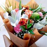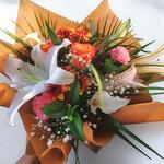 Подарите кому‑то радость этим сияющим букетом, наполненным цветом и элегантностью. В нем яркие оранжевые розы сочетаются с безупречно белыми лилиями, насыщенными хризантемами и нежно-розовыми гвоздиками — этот букет поистине является торжеством радости и красоты. Нежные веточки гипсофилы и пышная зелень добавляют текстуру и глубину, идеально завернутые в коричневую крафт-бумагу для естественного и тёплого завершения. Будь то день рождения, годовщина или просто слова благодарности, эта композиция передаёт искреннее послание с оттенком утончённости. Для оптимальной свежести подрежьте стебли по диагонали и поместите в свежую прохладную воду вдали от прямого солнечного света и источников тепла. Меняйте воду каждые два дня и удаляйте увядшие цветы, чтобы букет радовал вас дольше.