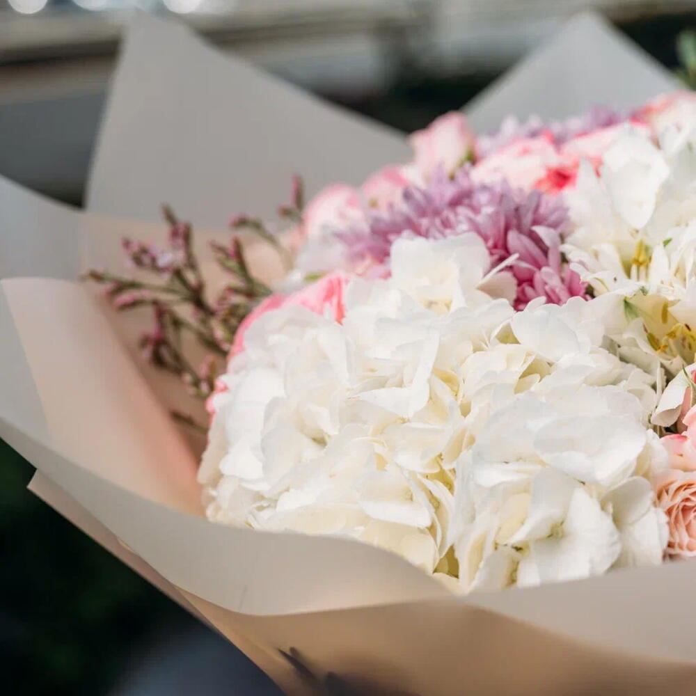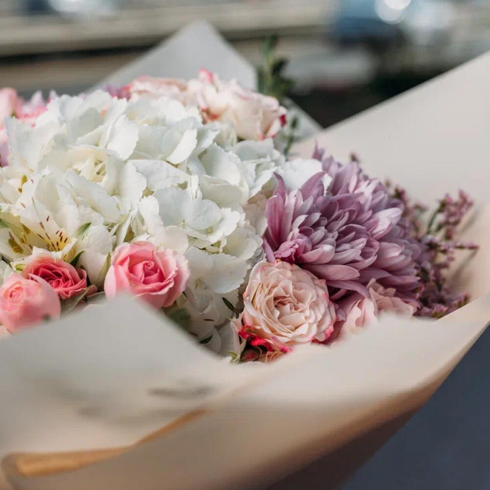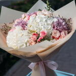 Eucalyptus - 2 шт. Spray rose - 6 шт. Limonium - 2 шт. Alstroemeria - 5 шт. hydrangea white - 3 шт. chrysanthemum purple - 3 шт.