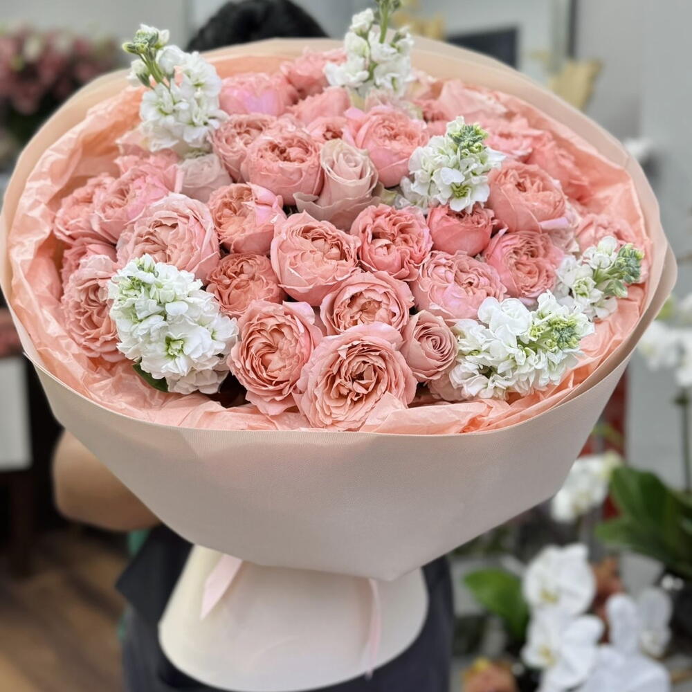 маттиола белая - 6 шт. peony rose julietta - 8 шт. одна роза афина розовая - 10 шт.