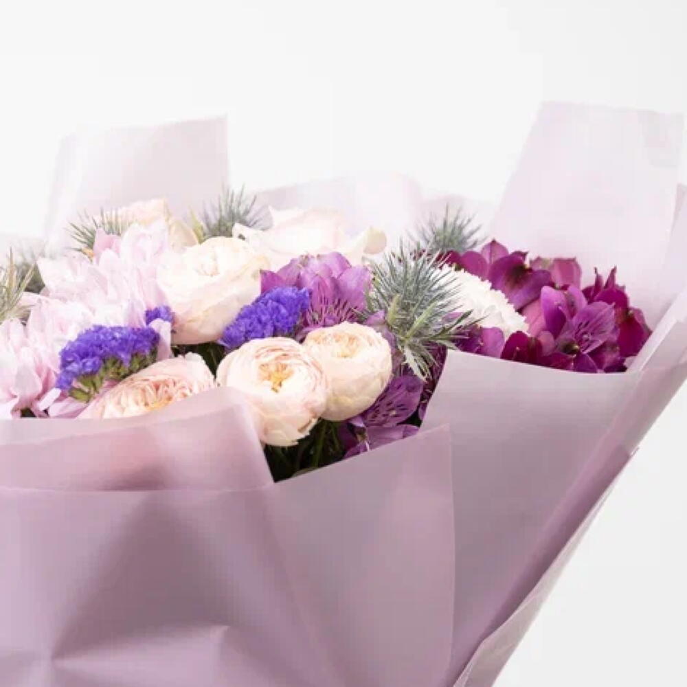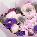 Statice - 2 шт. Peony rose - 2 шт. Chrysanthemum - 2 шт. Alstroemeria - 4 шт. rose - 3 шт. carnation - 2 шт. erygnium - 3 шт.