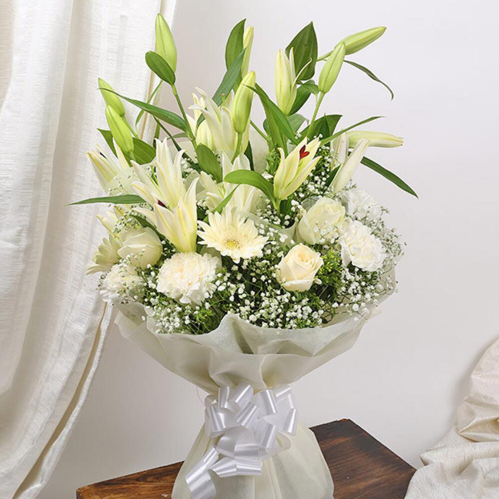 Ribbon - 1 шт. White rose - 7 шт. Wrapping - 1 шт. white lilly - 3 шт. gypso - 7 шт. белая гербера - 7 шт.