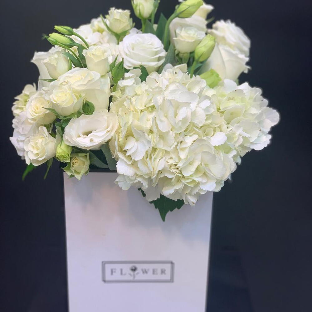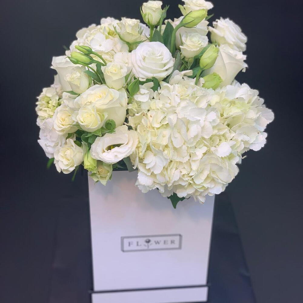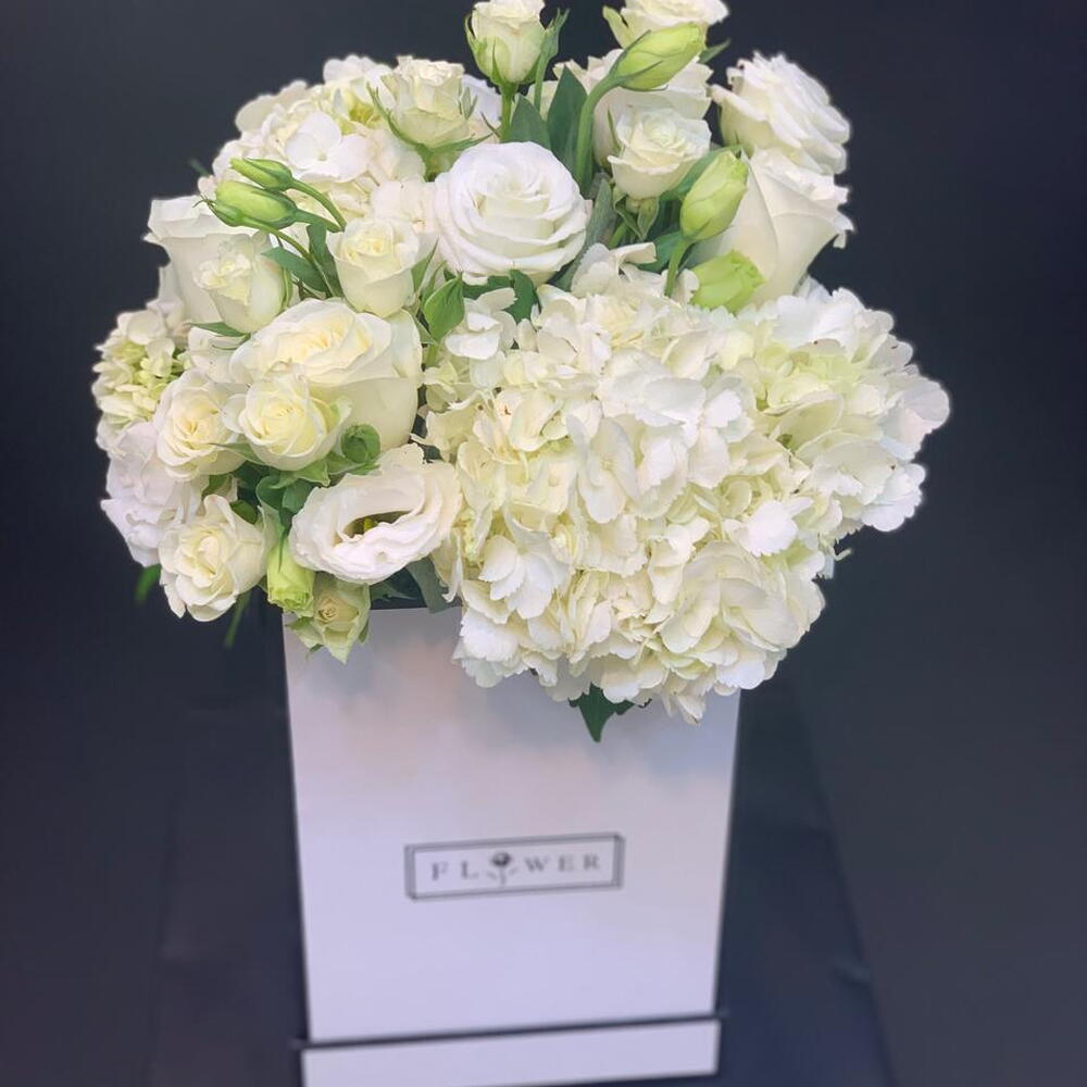 ГОРТЕНЗИЯ 2 ЛИЗИАНТУС 5 КУСТОВЫЕ РОЗЫ 5 РОЗЫ 5 В СРЕДНЕЙ КОРОБКЕ 1 AED 330..