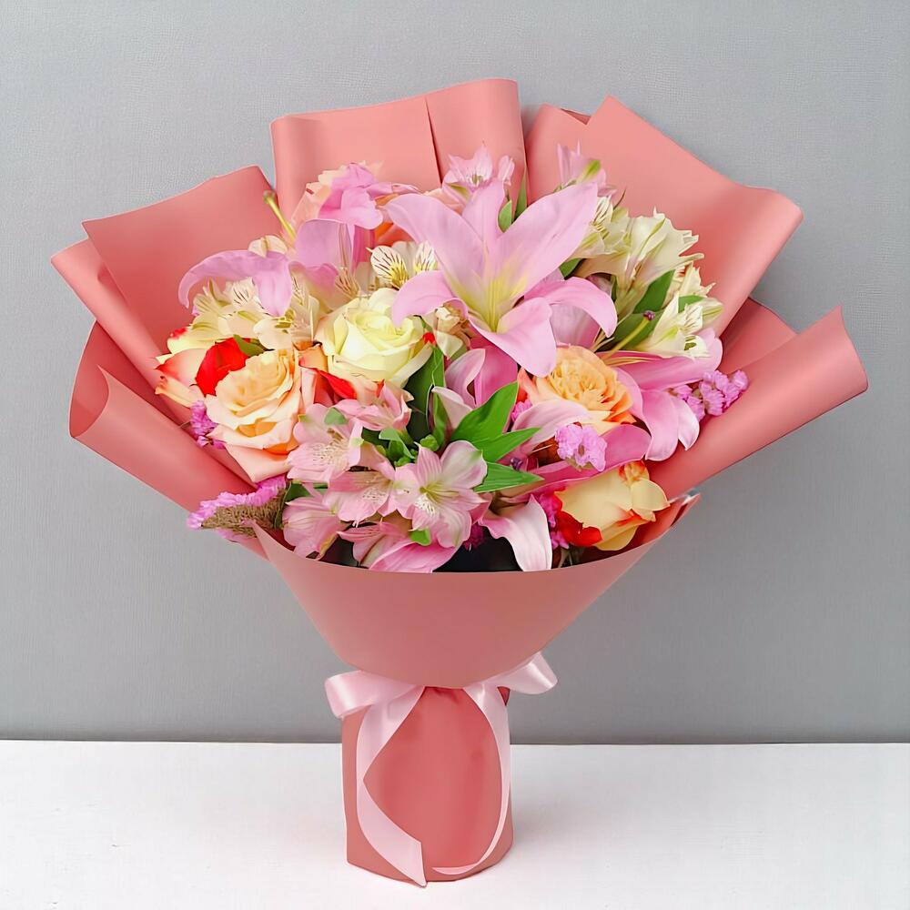 Яркий, женственный и наполненный радостными пастельными нотками — этот великолепный букет пастельных тонов представляет собой премиальный букет из смешанных цветов, призванный создать ощущение свежести, радости и элегантности. Он включает в себя ароматные розовые лилии (с бутонами и распустившимися цветами), нежные розовые альстромерии и красивую смесь роз нежных кремовых, персиковых и красных оттенков (романтический штрих к букету из роз), дополненную сезонными цветами, такими как статица/каспия и свежая зелень (состав цветов может немного меняться в зависимости от сезона, сохраняя при этом общий вид). Завернутый в стильную персиково-розовую бумагу и перевязанный лентой, это букет из свежих цветов, созданный из цветов премиум-класса — настоящий премиальный букет, который прекрасно смотрится на фотографиях. Идеально подходит в качестве букета на день рождения и является отличным выбором для подарка на день рождения. Этот букет также прекрасно подойдет в качестве поздравительного, с элегантными цветами для поздравлений, и как нежный романтический букет, наполненный цветами любви и романтики. Стильный, модный букет, всегда в тренде и поистине уникальный — идеально подойдет тем, кто ищет лучший букет в Дубае, а также станет прекрасным вариантом для годовщины.