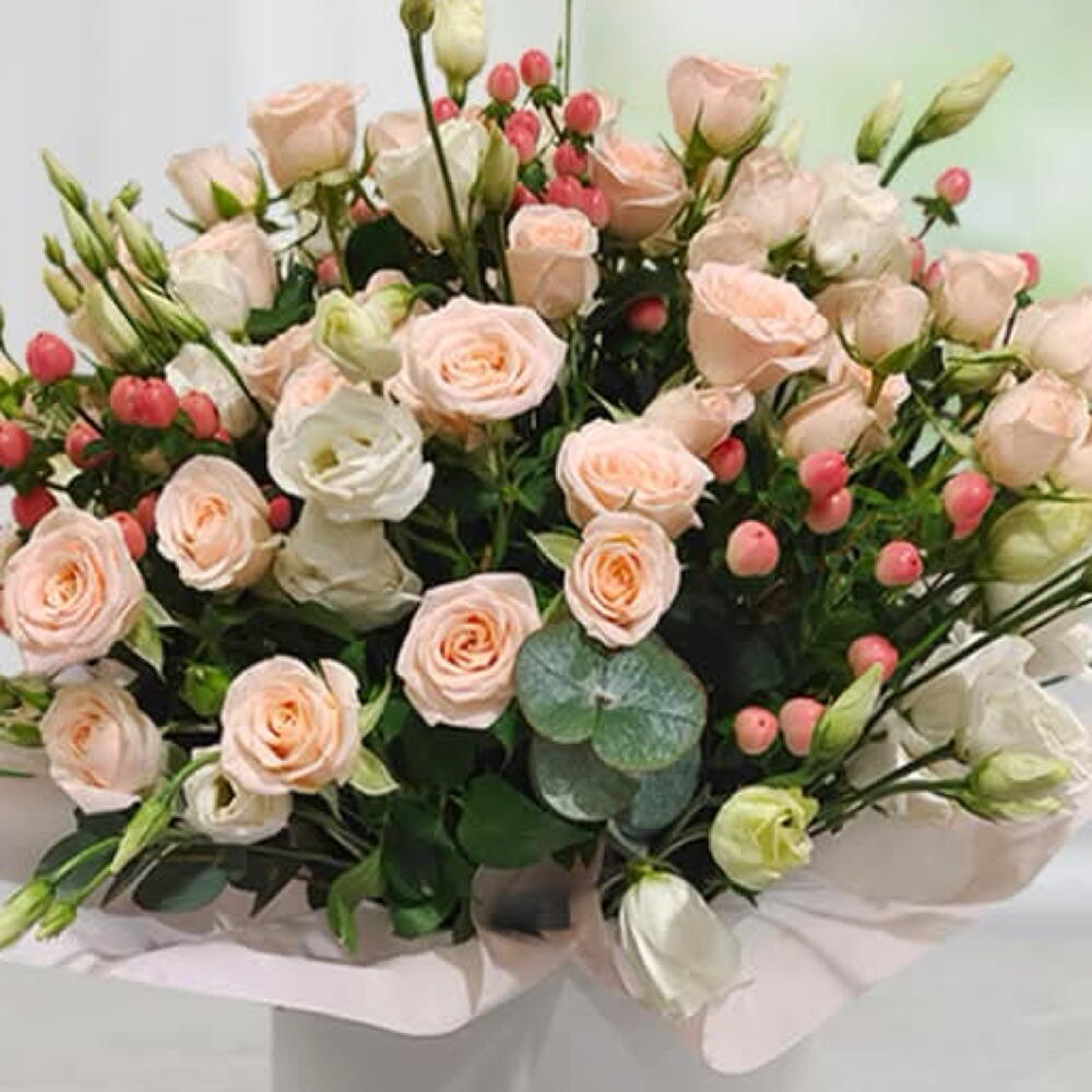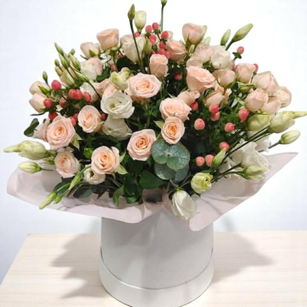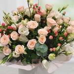 lisianthus white - 10 шт. cream spray rose - 20 шт. eucalyptus leaves - 6 шт. haybricom красный - 7 шт.