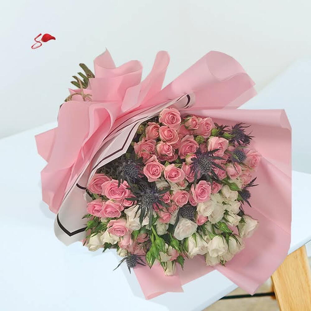 eryngium - 5 шт. spray rose white - 10 шт. бодрые розовые розы - 10 шт.