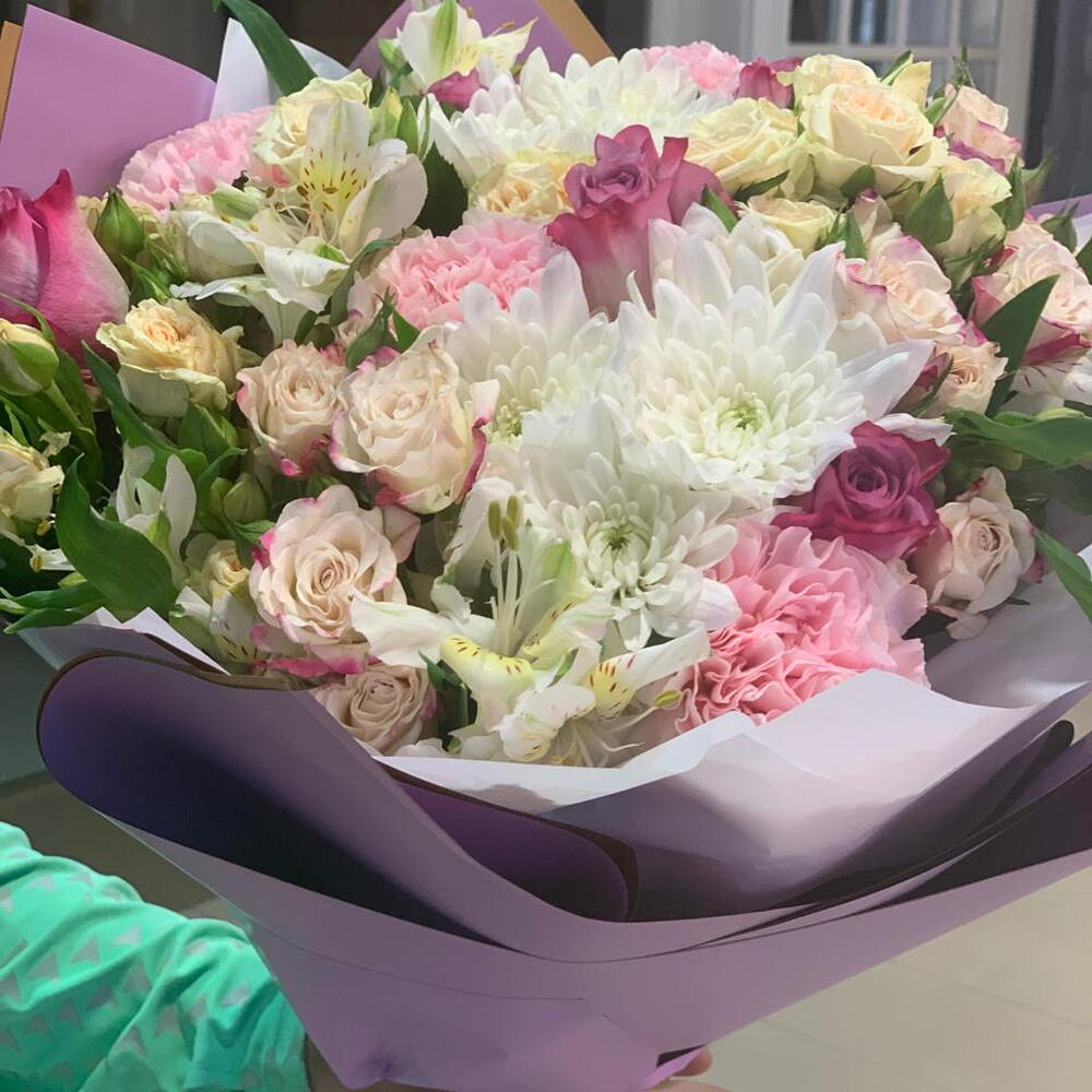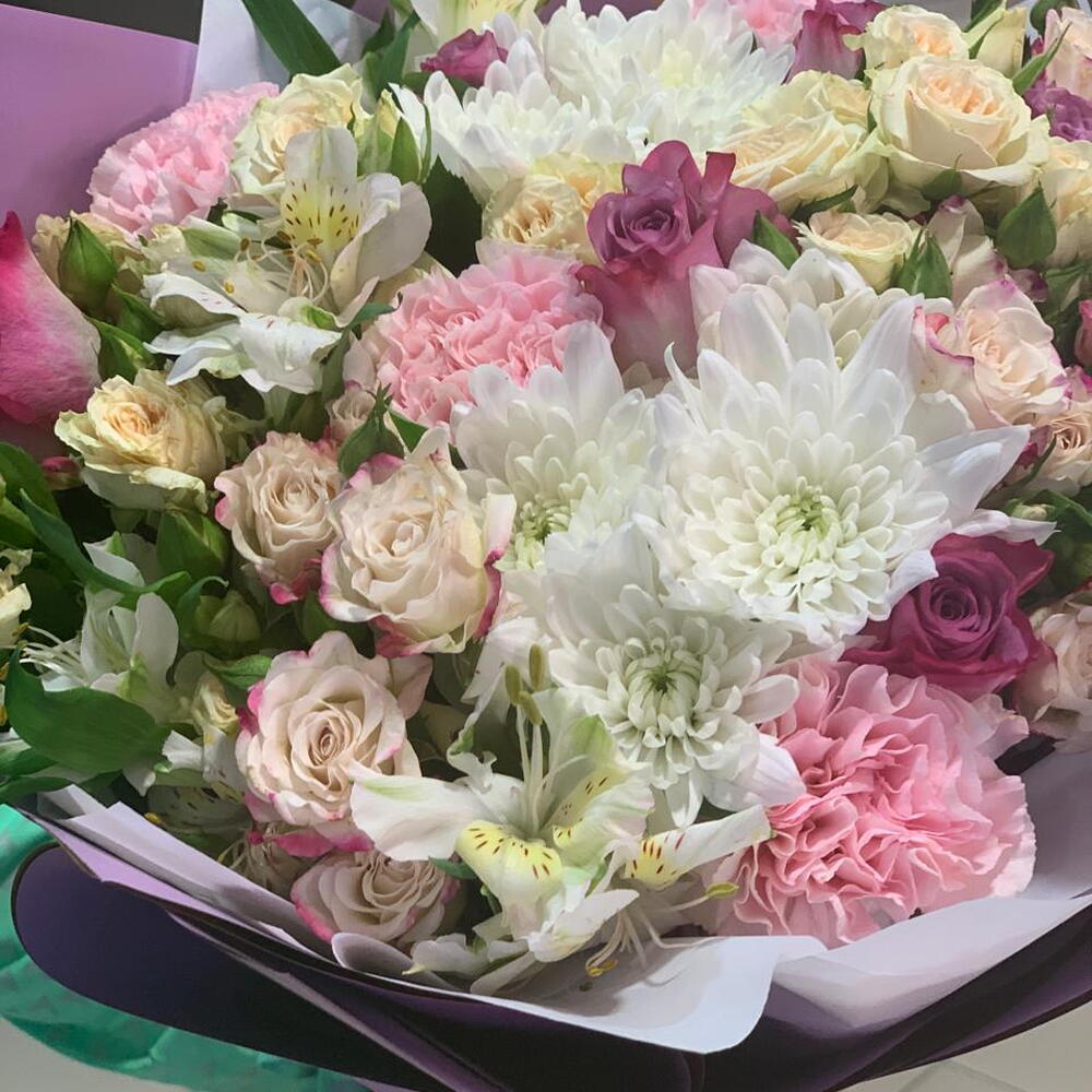 АЛАСТАМАРИЯ 5 ХРИЗАНТИЙ 3 ГВОЗДИКА 5 СПЕРИОЗНЫХ РОЗ 5 РОЗ 5 В БУКЕТЕ 325 ДИРХАМОВ,,.