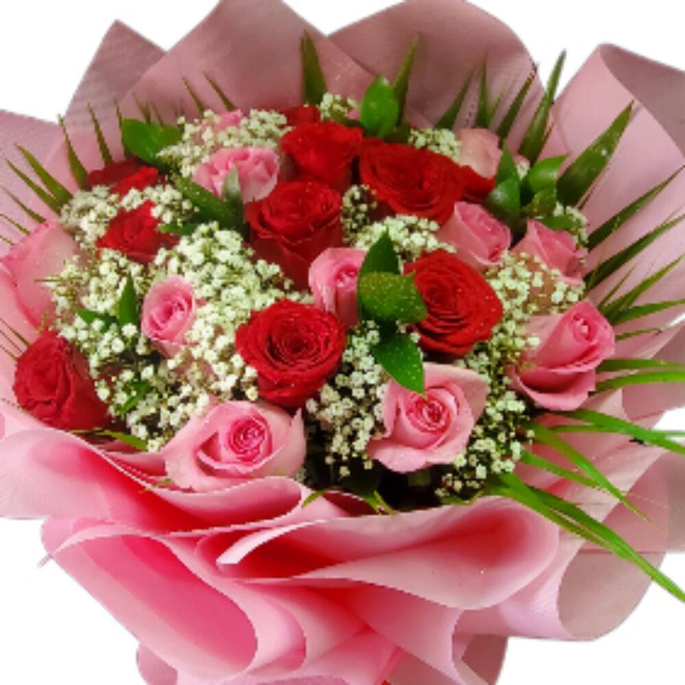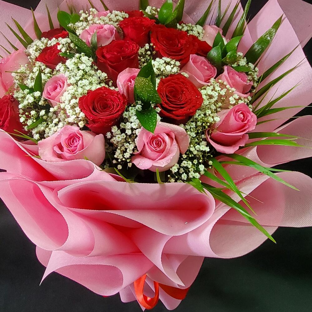 Red rose - 10 шт. Pink rose - 10 шт. ruscus israel - 7 шт. gipsofila - 7 шт.