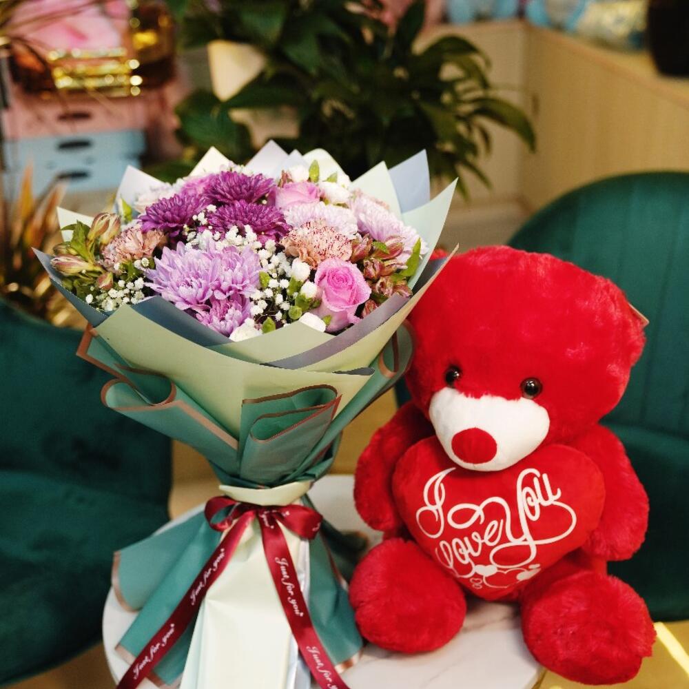baby rose pink - 2 шт. красный плюшевый мишка - 1 шт. pink roses - 5 шт. альстромерия розовая - 3 шт. гипсофила - 5 шт. гвоздика movha - 3 шт. белая мини-гвоздика - 3 шт. розовая и фиолетовая хризантема - 4 шт.