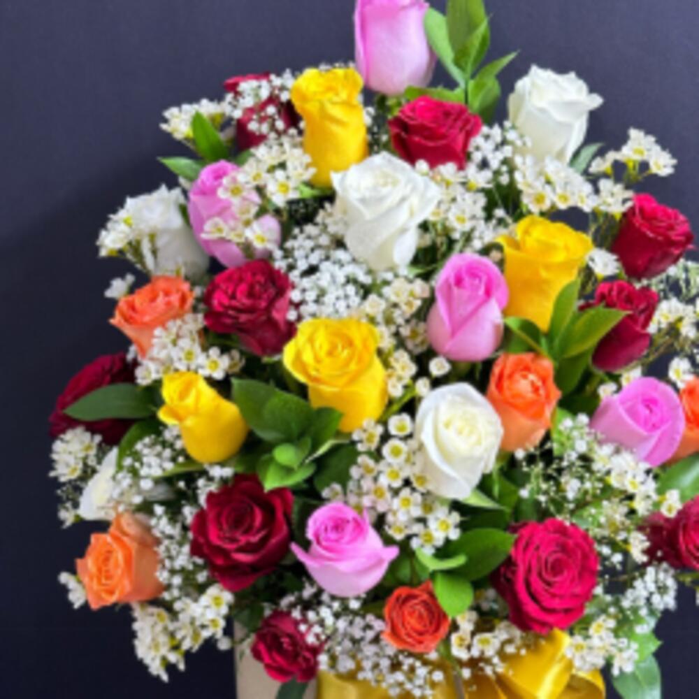 Эта красивая композиция из разноцветных роз поставляется в коробке, что делает её идеальным подарком для любого случая. С 35 розами разных цветов она наверняка скрасит любую комнату и вызовет улыбку на лице вашего близкого.