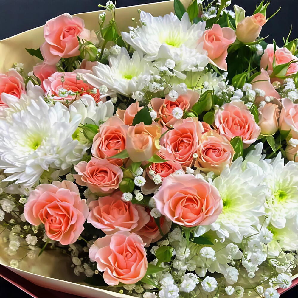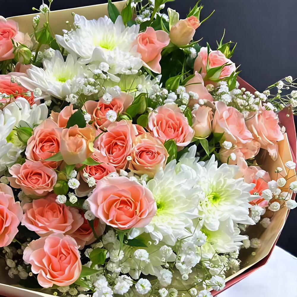 Нежный, мечтательный и полный тепла, букет «Sweet Embrace» – это очаровательное сочетание нежных розочек и элегантных белых хризантем. Это прекрасное цветочное сочетание создаёт нежное, но в то же время яркое выражение привязанности и радости, идеально подходящее для любого случая. Отмечаете ли вы день рождения, благодарите или просто дарите любовь, этот букет дарит красоту и нежность в каждом цветке. Упакованный вручную в роскошную пастельную упаковку и украшенный атласной лентой, он станет идеальным цветочным подарком для приятных моментов. Инструкция по уходу: Поставьте букет в чистую воду комнатной температуры, прежде чем переставлять его в вазу. Избегайте прямых солнечных лучей и источников тепла. Меняйте воду каждые 1-2 дня и слегка подрезайте стебли под углом, чтобы они дольше оставались свежими.