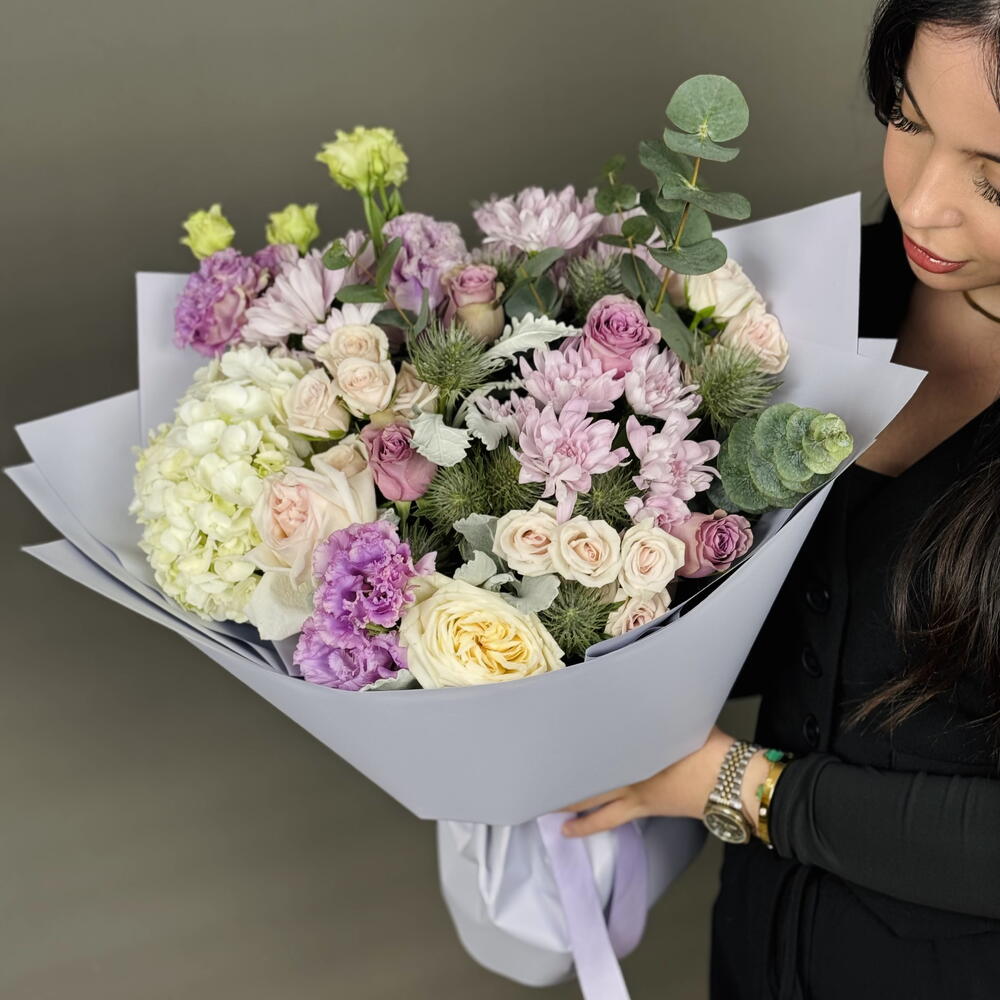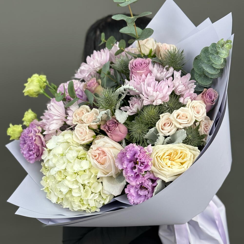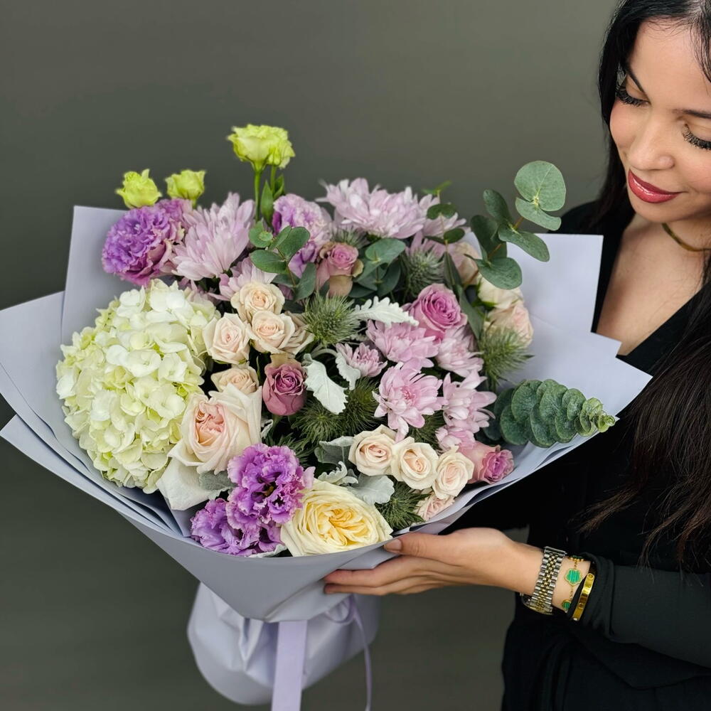 Почувствуйте истинную преданность искусного флориста, выбрав эту исключительную цветочную композицию. В сердце этого великолепного букета – очаровательная гортензия, окруженная тремя хризантемами и парой изысканных охар. Дополняют ансамбль привлекающие внимание эрингиумы, чей металлический голубоватый оттенок контрастирует с нежными кустовыми розами и величественными эустомами. Пять впечатляющих роз, известных своей непреходящей элегантностью, придают букету роскошный вид, а экзотический эвкалипт и листва сорта «Дасти Миллер» создают насыщенный зеленый фон, подчеркивая яркую палитру цветущих цветов. Этот эксклюзивный букет, созданный с любовью к цветам, гарантирует прекрасное настроение в любой ситуации.