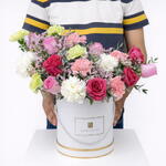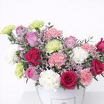 white carnations - 3 шт. pink carnations - 4 шт. green carnations - 4 шт. розовый лимониум - 3 шт. темно-розовые розы - 4 шт. pink roses - 5 шт. листья pulviforea - 2 шт. белая коробка-барабан - 1 шт.