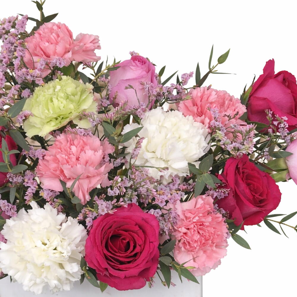 white carnations - 3 шт. pink carnations - 4 шт. green carnations - 4 шт. розовый лимониум - 3 шт. темно-розовые розы - 4 шт. pink roses - 5 шт. листья pulviforea - 2 шт. белая коробка-барабан - 1 шт.