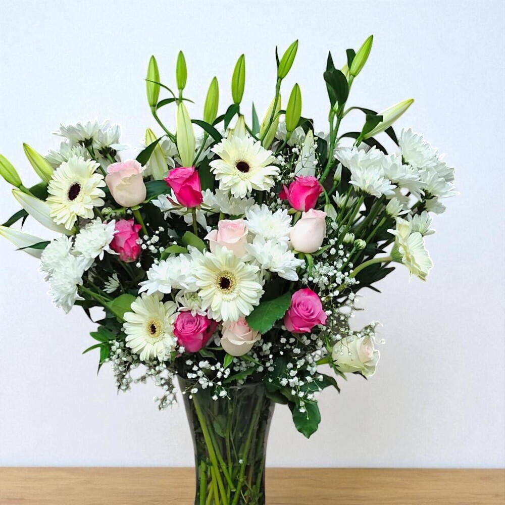 Этот букет – изящная симфония нежно-розовых роз, кремовых гербер и белоснежных лилий – источает чистую элегантность. Каждый цветок аккуратно расположен в высокой стеклянной вазе, создавая потрясающую вертикальную композицию, дышащую свежестью и очарованием. Ярко-розовые акценты добавляют игривый яркий акцент, идеально сочетающийся с нежным ароматом гипсофилы и пышной зеленью. Идеально подходит для дней рождения, годовщин или просто для того, чтобы украсить чьё-то пространство красотой и светом. Этот букет произведет неизгладимое впечатление своим свежим ароматом и романтической цветовой палитрой. По-настоящему продуманный подарок для кого-то особенного – или роскошное угощение для себя.