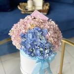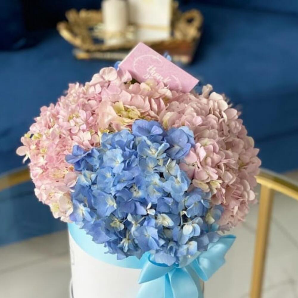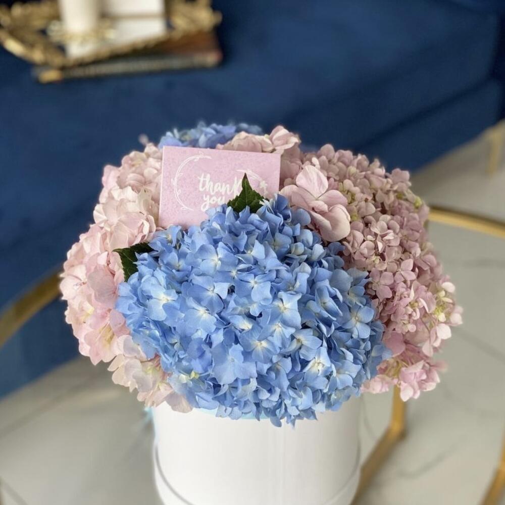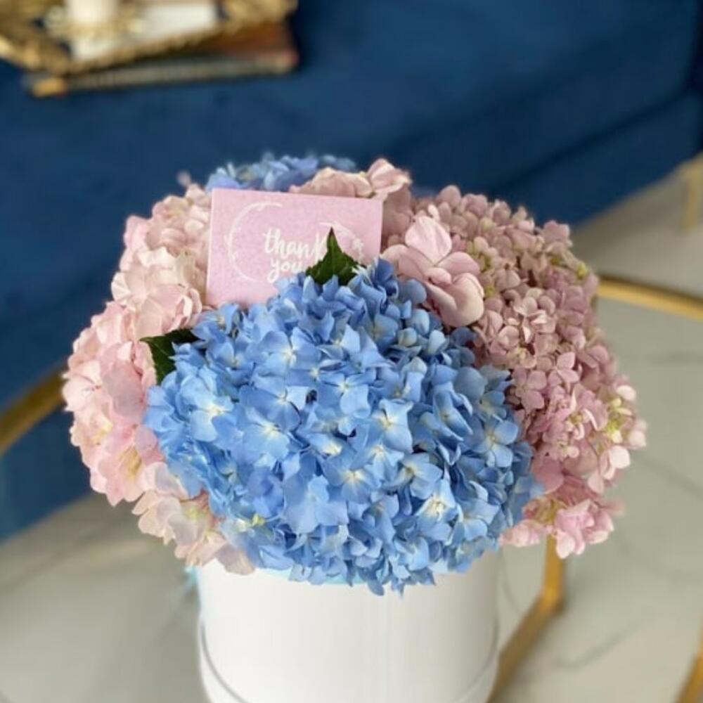 Mixed hydrangea bouquet in a hat box