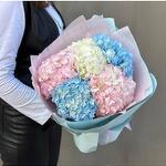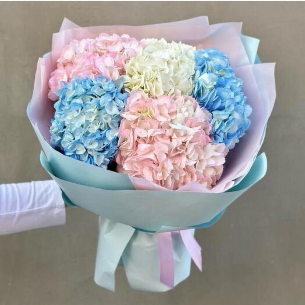 blue hydrangea - 2 шт. white hydrangea - 1 шт. pink hydrangea - 2 шт. оберточная бумага - 4 шт.