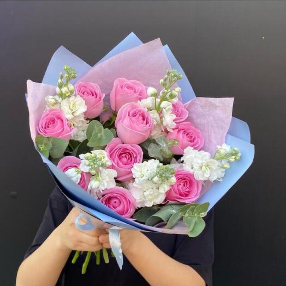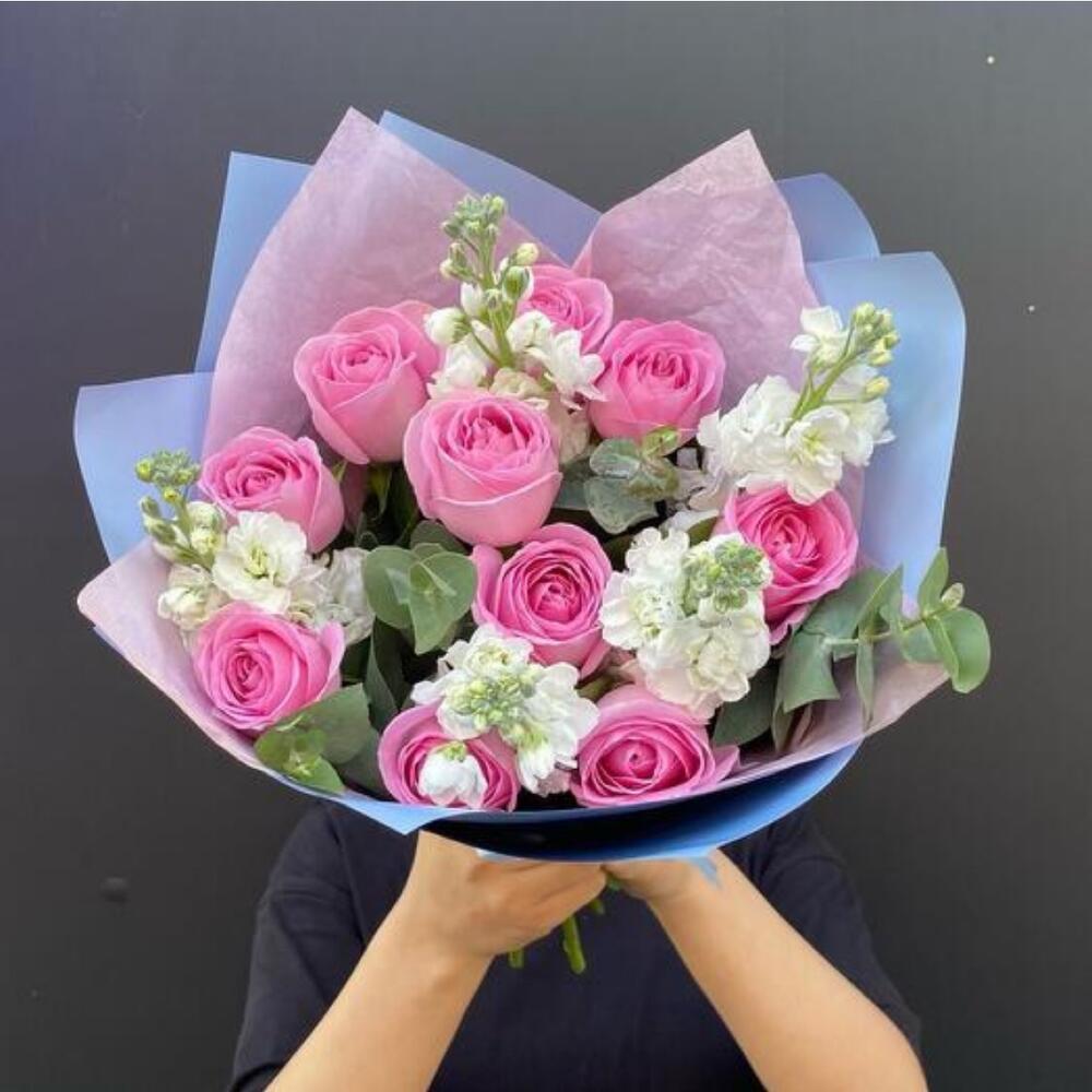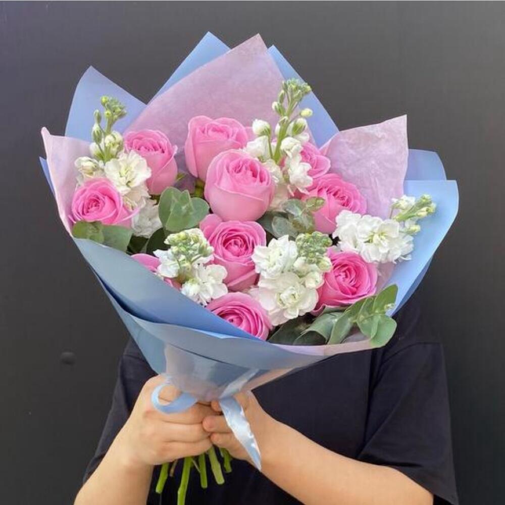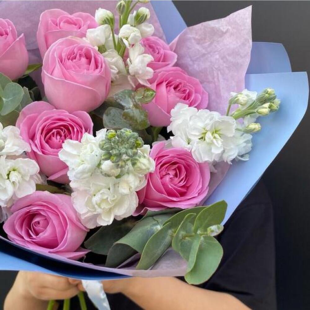 Satin ribbon - 1 шт. эвкалипт - 4 шт. розовая роза Revival - 10 шт. белая маттиола - 5 шт. упаковочная бумага синяя - 2 шт. розовая бумага тишью - 3 шт.