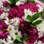 Цветы: Плотная, пышная композиция из хризантем двух цветов: • Яркие хризантемы магента/пурпурного цвета (большинство) • Свежие белые хризантемы (вкрапления для контраста) • Зелень: Свежие зелёные листья (вероятно питтоспорум или аналогичная заполняющая зелень), размещённые между цветами для текстуры и цветового контраста. • Упаковка: Красиво оформлена в мягкую светло-розовую/пудровую обёрточную бумагу, образующую большую круговую основу, придающую роскошный, пышный вид. • Размер: Это очень большой, впечатляющий букет — он полностью закрывает верхнюю часть тела человека и держится обеими руками. • Стиль: Классический круглый букет, связанный вручную, очень популярен в качестве подарка, на дни рождения, годовщины или особые случаи.