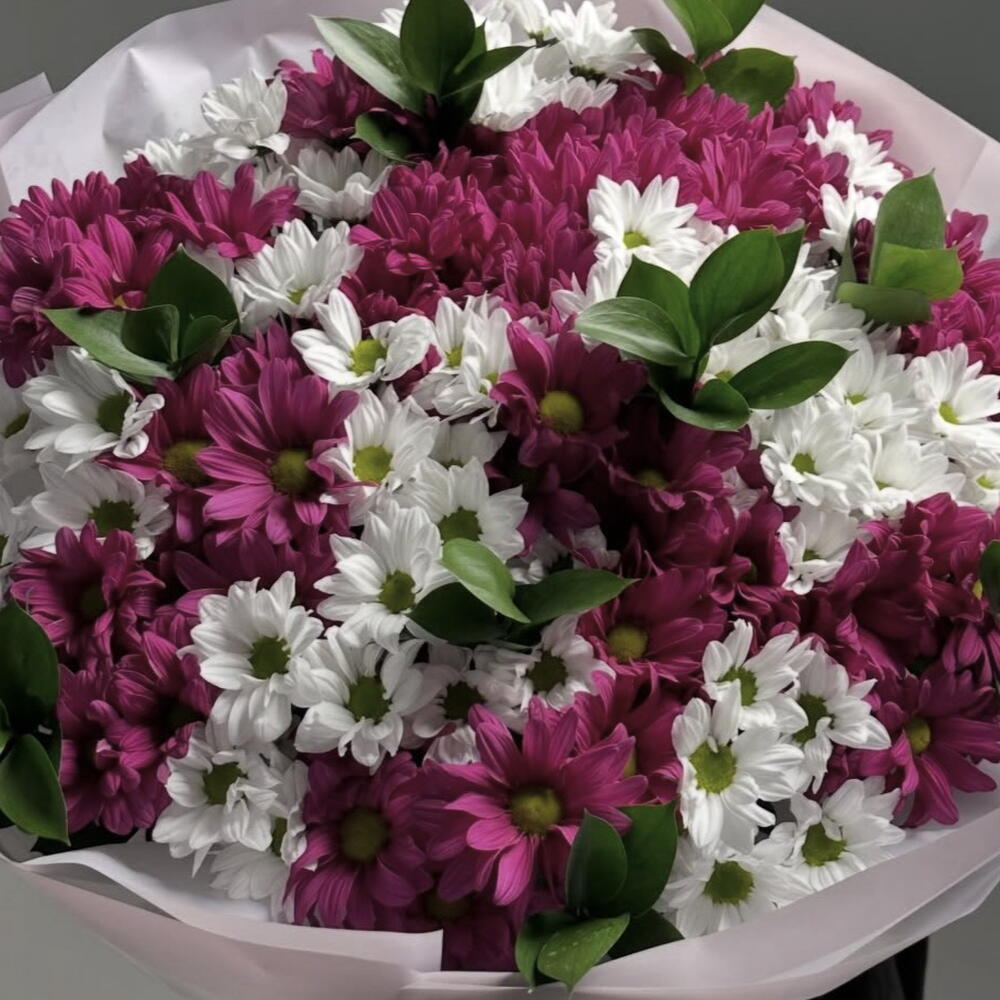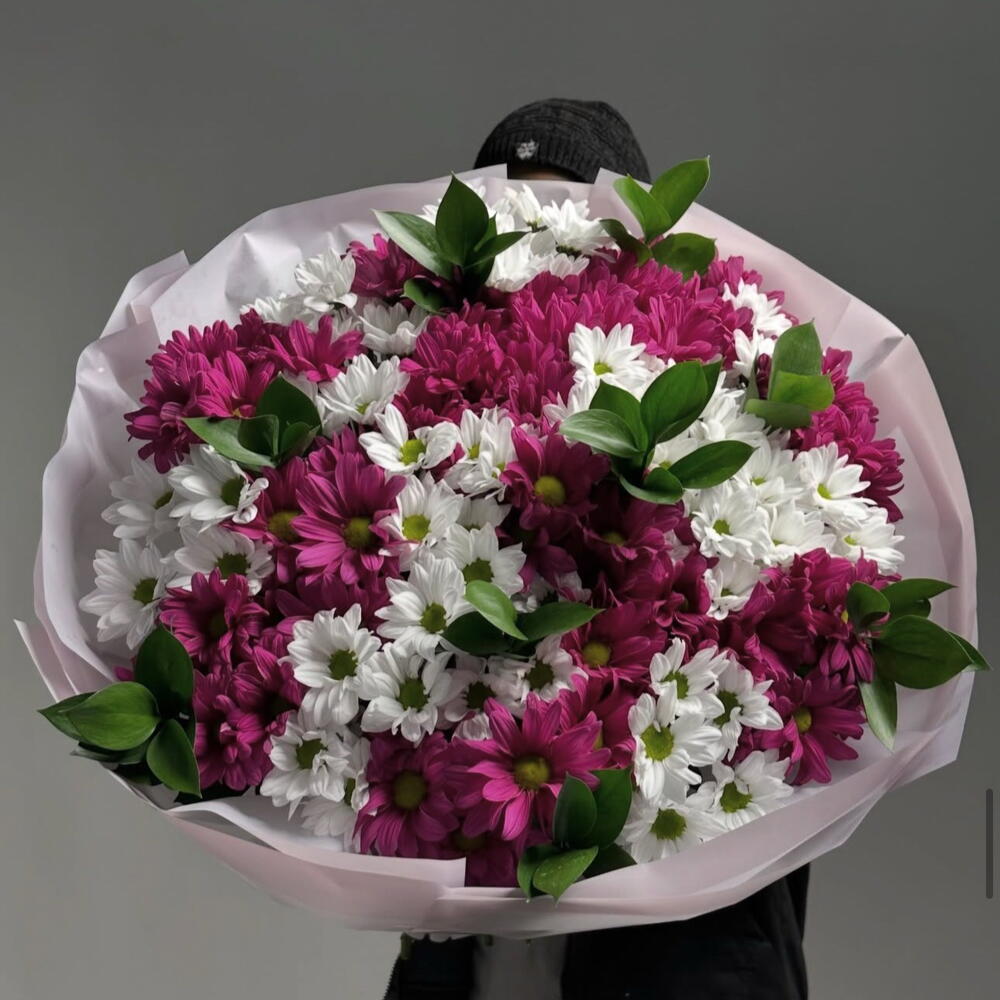 Цветы: Плотная, пышная композиция из хризантем двух цветов: • Яркие хризантемы магента/пурпурного цвета (большинство) • Свежие белые хризантемы (вкрапления для контраста) • Зелень: Свежие зелёные листья (вероятно питтоспорум или аналогичная заполняющая зелень), размещённые между цветами для текстуры и цветового контраста. • Упаковка: Красиво оформлена в мягкую светло-розовую/пудровую обёрточную бумагу, образующую большую круговую основу, придающую роскошный, пышный вид. • Размер: Это очень большой, впечатляющий букет — он полностью закрывает верхнюю часть тела человека и держится обеими руками. • Стиль: Классический круглый букет, связанный вручную, очень популярен в качестве подарка, на дни рождения, годовщины или особые случаи.