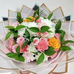 Ruscus - 10 шт. carnation white - 10 шт. carnation pink - 10 шт. хризантема - 2 шт. маленькая роза - 2 шт. оранжевая роза - 2 шт.