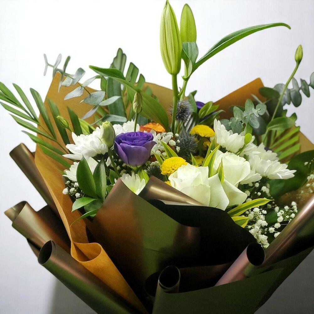 Alstroemeria - 2 шт. Gypsophila - 5 шт. chrysanthemum bush - 2 шт. rose - 4 шт. lily white - 1 шт.