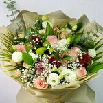 Ruscus - 7 шт. Gypsophila - 6 шт. rose - 9 шт. carnation - 3 шт. lisianthus white - 5 шт. зелёные пуговицы - 4 шт.