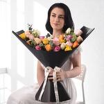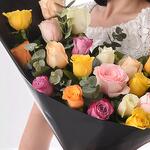 Celebrate life’s vibrant moments with the Modern Mélange Mix Roses Bouquet — a radiant floral display bursting with color and joy. This striking arrangement features 24 premium roses in a stunning mix of white, pink, orange, yellow, peach, and purple tones, symbolizing love, gratitude, happiness, and admiration. Lush 12 stems of ruscus and 5 stems of eucalyptus provide fragrant greenery and graceful texture, adding depth and dimension to this bouquet. Elegantly wrapped in glossy black designer paper and finished with a soft white satin ribbon, it’s the perfect harmony of modern style and floral elegance.