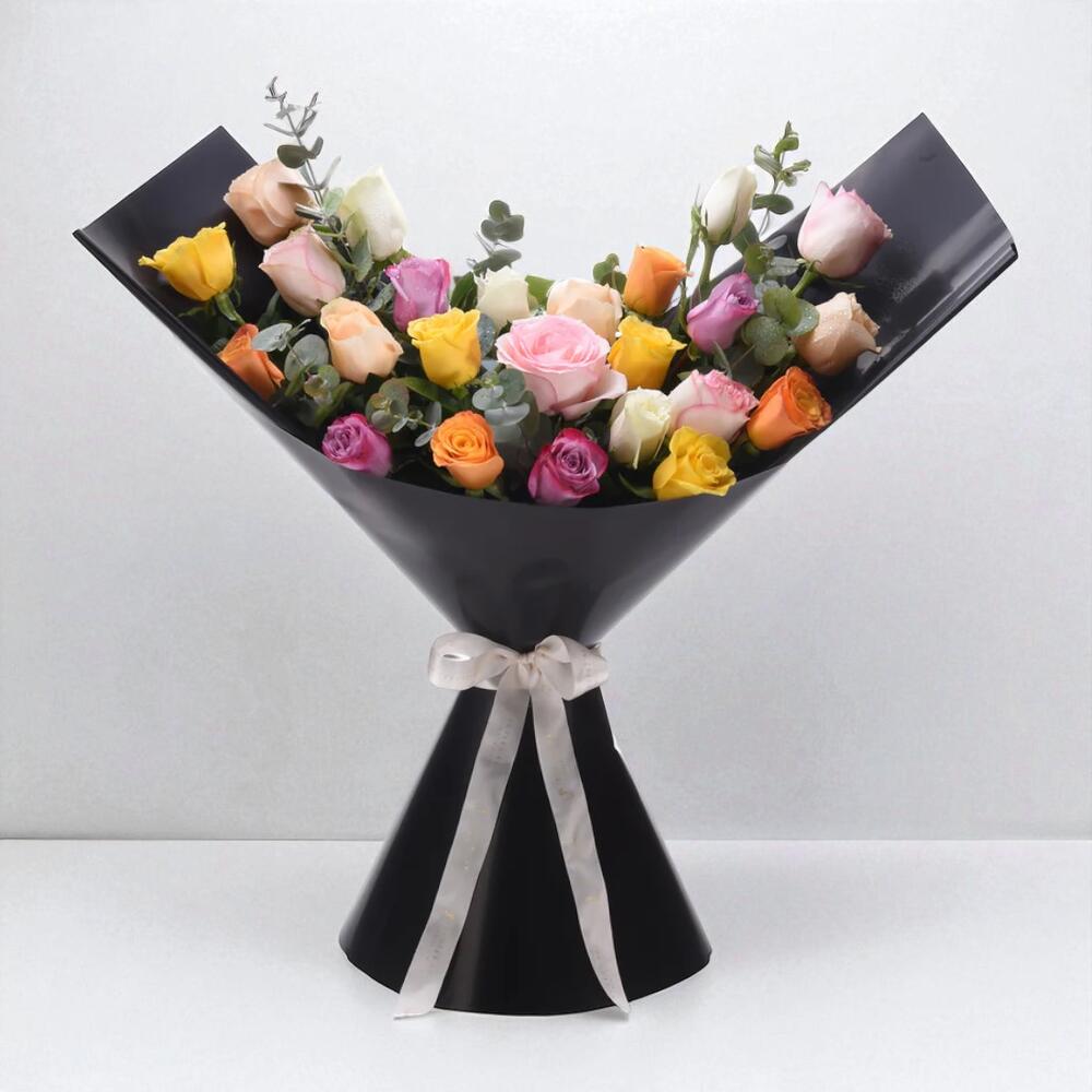 Celebrate life’s vibrant moments with the Modern Mélange Mix Roses Bouquet — a radiant floral display bursting with color and joy. This striking arrangement features 24 premium roses in a stunning mix of white, pink, orange, yellow, peach, and purple tones, symbolizing love, gratitude, happiness, and admiration. Lush 12 stems of ruscus and 5 stems of eucalyptus provide fragrant greenery and graceful texture, adding depth and dimension to this bouquet. Elegantly wrapped in glossy black designer paper and finished with a soft white satin ribbon, it’s the perfect harmony of modern style and floral elegance.