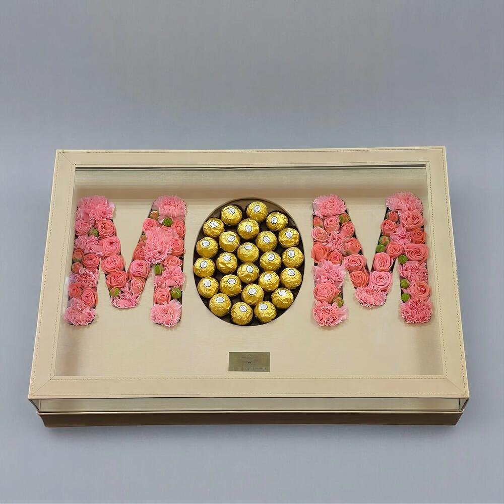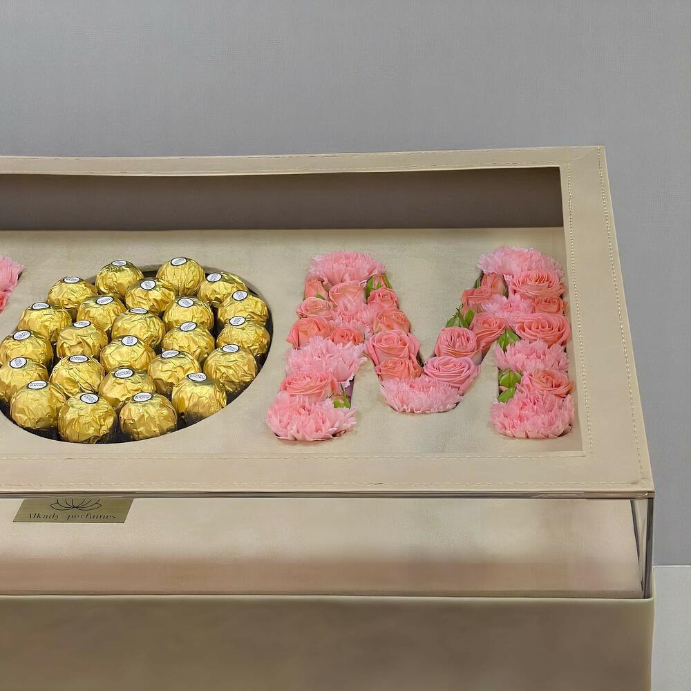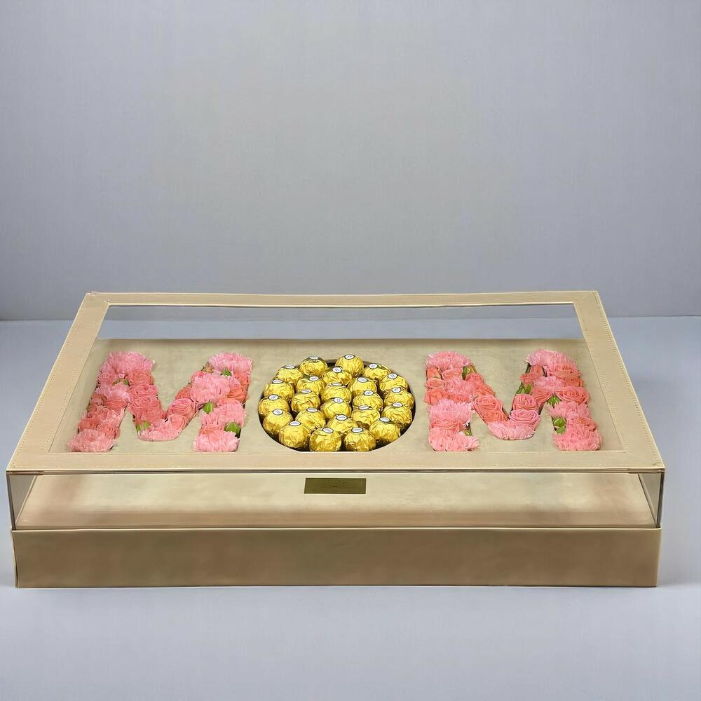 carnation - 14 шт. ferrero rocher chocolates - 1 шт. pink roses - 25 шт. большая акриловая коробка, изготовленная с заботой - 1 шт.