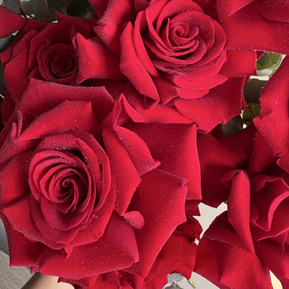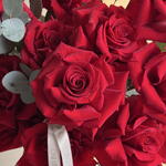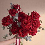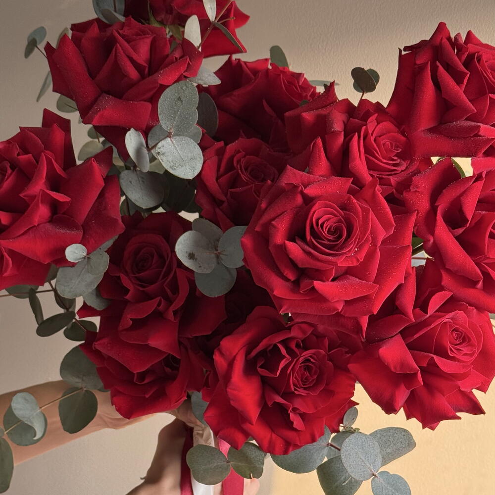 A bouquet of deep red roses complemented by fresh eucalyptus. Structured, expressive, and easy to read — a bouquet that feels both timeless and modern.