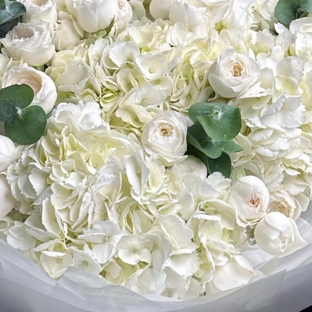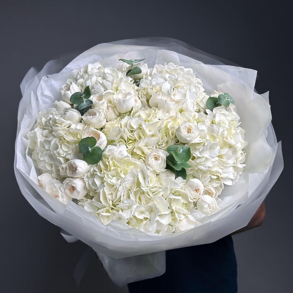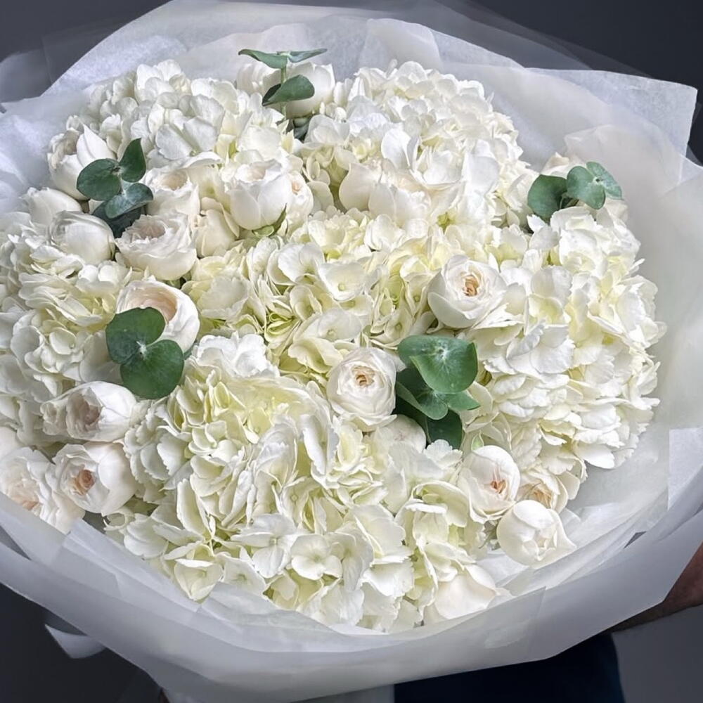 hydrangea white - 8 шт. wrapping paper - 8 шт. ветки эвкалипта - 5 шт. роза садового распыления - 10 шт.