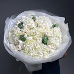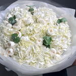 Этот крупный, роскошный букет — мастер-класс по монохромной фактуре. Используя только белые цветы и минимум зелени, акцент смещается на различные формы и строение лепестков. Букет оформлен многослойной обёрткой из тишью и матовой плёнки. Выбор полупрозрачной белой упаковки создаёт сияние вокруг цветов, подчёркивая их чистоту. Круглый, куполообразный силуэт делает его идеальным выбором для подарков премиум-класса, свадеб или официальных годовщин.