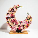 Ощутите цветочное мастерство как никогда прежде с нашей композицией в форме луны — удивительным сочетанием элегантности и фантазии. Дизайн в форме полумесяца состоит из свежих роз, хризантем и лизиантусов в романтических оттенках розового, персикового и бордового. Это по-настоящему эффектный элемент декора, идеально подходящий для праздников, романтических жестов или в качестве роскошного украшения интерьера. Созданная с точностью и страстью, она добавляет любому пространству очарование и тепло. Чтобы сохранить цветы яркими, слегка опрыскивайте их ежедневно и избегайте прямых солнечных лучей или чрезмерной жары.