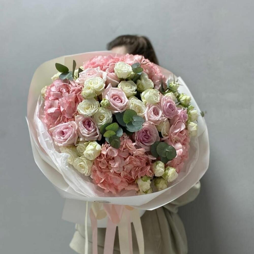 Eucalyptus - 5 шт. pink hydrangeas - 5 шт. pink roses - 10 шт. white roses - 10 шт. белые спрей-розы - 10 шт.