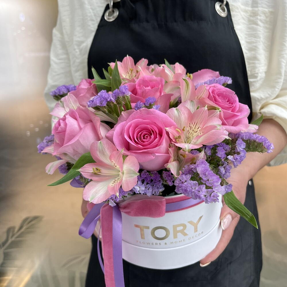 Composition: pink rose - 7, Alstroemeria - 3, Statica import - 3 Sizes: WIDTH - 17CM; HEIGHT - 20CM; LENGTH - 20CM; (including packaging) Размер: 17 x 20 x 20 см