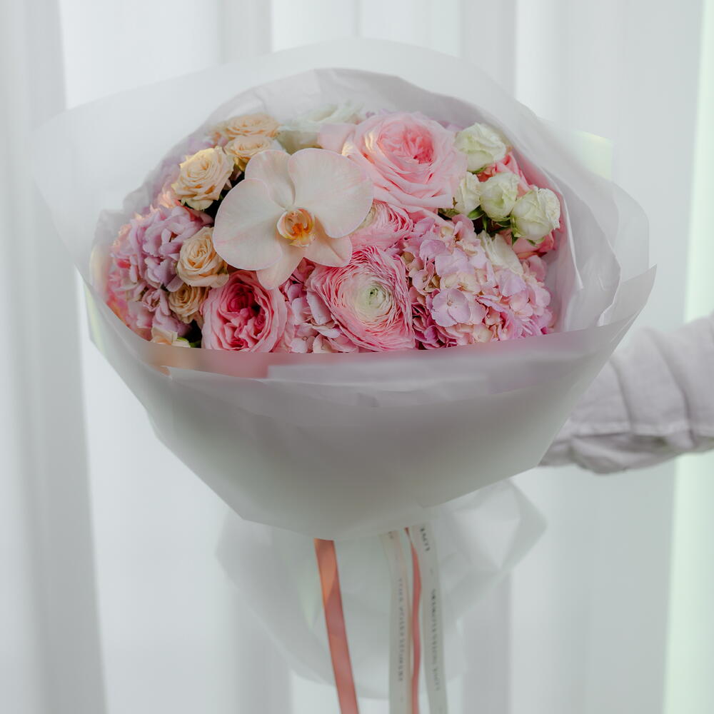 Orchid - 1 шт. cream spray rose - 4 шт. pink hydrangea - 3 шт. pink o'hara - 1 шт. pink ranunculus - 3 шт. персиковые спрей-розы - 6 шт.