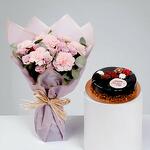 Букет из 7 светло-розовых гвоздик и 6 фиолетовых кустовых роз с фундуковым тортом 0,5 кг — комбо, чтобы выразить вашу любовь и признательность вашей маме.