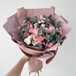 Eucalyptus - 8 шт. pink carnations - 4 шт. pink alstroemeria - 4 шт. розовые спрей-розы - 5 шт. белые спрей-розы - 3 шт. peach garden roses - 3 шт.