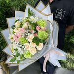 baby breath - 2 шт. green carnations - 5 шт. листья рускуса - 5 шт. Свит Сара кустовая роза - 4 шт. персиковые спрей-розы - 3 шт. альстромерия - 3 шт. белое покрытие - 5 шт.