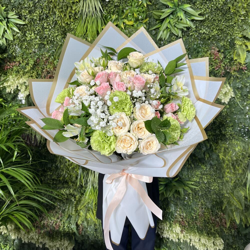 baby breath - 2 шт. green carnations - 5 шт. листья рускуса - 5 шт. Свит Сара кустовая роза - 4 шт. персиковые спрей-розы - 3 шт. альстромерия - 3 шт. белое покрытие - 5 шт.