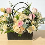 Насладитесь нежной красотой этой очаровательной композиции из нежно-розовых и кремовых роз цвета слоновой кости, помещённой в элегантную дизайнерскую коробку. Этот букет, украшенный веточками гипсофилы, эвкалипта и свежей зелени, излучает изящество и утончённость. Этот подарок идеально подходит для выражения любви, признательности или тёплых пожеланий, он скажет многое самым нежным образом. Стильная чёрная коробка, вдохновлённая дамской сумочкой, добавит современности классическому цветочному букету. Будь то день рождения, годовщина или просто праздник, этот букет сделает каждое мгновение незабываемым. Нежный, элегантный и совершенно очаровательный – это любовь, окутанная пастельными лепестками.